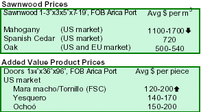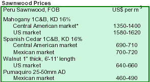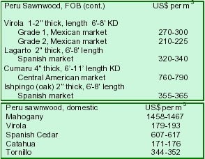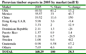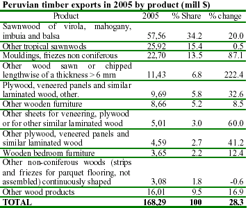Latest statistics show that Peruvian exports of timber and timber products reached $168.3 million in 2005, up 28% from 2004 but below the projected $180 million.
