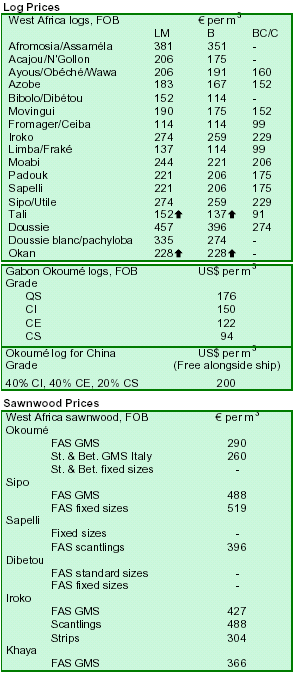Lumber prices are unchanged through February, though demand is reported as strong. Sapele stocks in the main consumer markets are much reduced and buyers are already making replacement purchases. Demand is also picking up for makore and sipo, with exporters expecting higher prices as supply from Northern Republic of Congo begins to dip as the rainy season starts. Planed and processed azobe and some of the red species are in demand for Europe. Moreover, some garden furniture and other manufactured products are beginning to