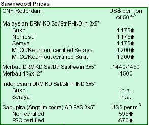 travelling to Malaysia to examine the situation more closely while a growing number of importers are making efforts to place some forward orders. Even 3x5", a size that was long out of favour, is being bought again. Popular items such as 2.1/2x6¡±, 7/4x12¡± and 4x5¡± are now sold out. Meanwhile, prices of KD DRM PHND 3x5¡± CNF Rotterdam are reaching historic highs. Some analysts forecast that these will surpass the $1,200 per ton CNF Rotterdam-mark very soon.