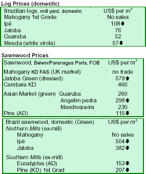 Domestic prices for timber products fell by an average 0.6% in April in spite of a further strengthening of the Brazilian currency. The decline was due to lower exports as Brazilian products continue to lose international competitiveness.