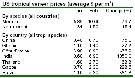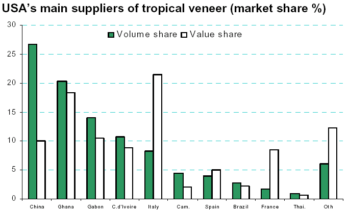 higher than Chinese veneer but lower than Ghanaian A fairly large quantity of tropical veneer in the USA comes from non-tropical countries, which re-export