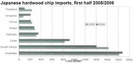 Japan’s main hardwood chip suppliers were Australia (up 3.5% to 1.87 million bdmt of hardwood chips), South Africa (down 13.4% to 1.4 million bdmt) and Chile (up 11% to under 1 million bdmt, mainly eucalyptus chips). Uruguay was emerging as an important supplier of woodchips (notably eucalyptus E. globules).