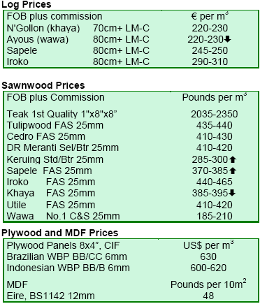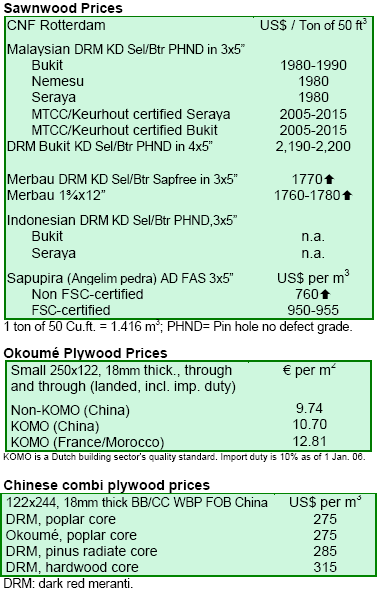 There was active trade of meranti, sapele and sapupira rough sawn timber, tough less dynamic than in the May-mid July period due to adequate inventory levels. Demand for meranti sawnwood continued to be quiet although some traders reported activity for quick deliveries of drm 3x5¡± and particularly 4x5¡±. Items in thickness 7/4¡± and, to a lesser extent, 2 1/2¡± were trading slowly. Overall, the CNF Rotterdam level of most meranti products remained extremely firm and changes were not