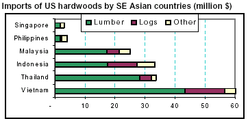 Total exports of US hardwood products to Southeast Asia moved ahead of the global trend (up 6.9%) in 2006,increasing 13% to $159 million, according to the
