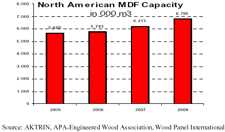 The capacity growth in the North American MDF industry was only marginally higher this year but it will likely accelerate a bit next year. In 2007, new installations added about 8.2% to capacity to reach approximately 6.2 million m3 up from 5.7 million m3 the year before. Next year, capacity is predicted to advance by about 9.3% or slightly in excess of one-half million m3 to a total of approximately 6.8 million m3.