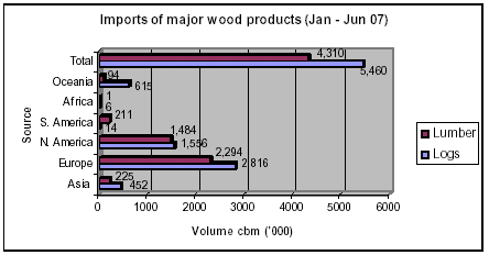 While imports of wood products slightly decreased in volume during the first half of 2007, they