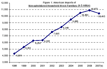 imports in 2007 are estimated at USD994 million, which is 3.6% of overall American furniture imports. Growth