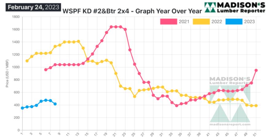 At the end of February, despite a noticeable reduction in lumber manufacturing since Q4 2022, supply was ample enough that prices dropped significantly. A fresh round of harsh winter weather, including in southern California, brought a stop to any construction activity that might still have been going on.