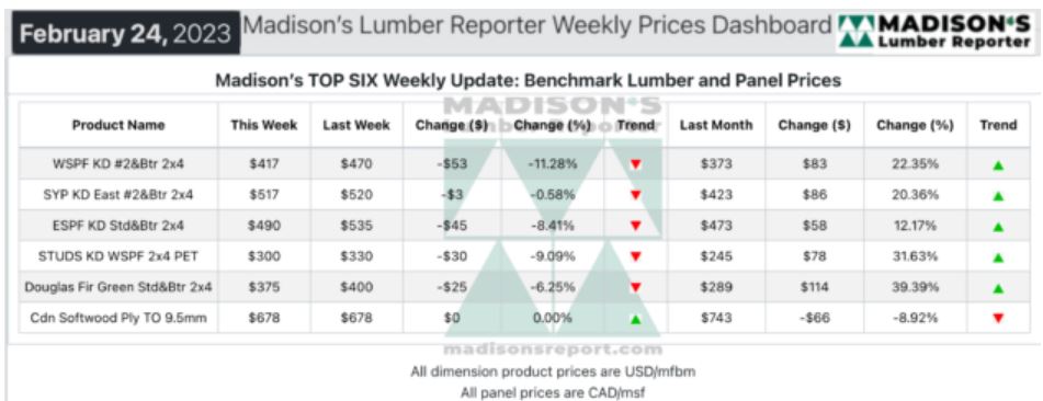In the week ending February 24, the price of Western Spruce-Pine-Fir 2×4 #2&Btr KD (RL) was US$417 mfbm, which is down by $53, or 11 per cent, from the previous week when it was $470. That week’s price is up by $45, or 12 per cent, from one month ago when it was $373.
