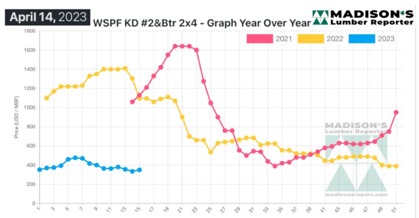 Compared to the same week last year, when it was US$1,096 mfbm, the price of Western Spruce-Pine-Fir 2×4 #2&Btr KD (RL) for the week ending April 14, 2023 this price was down by $746, or 68 per cent. Compared to two years ago when it was $1,130, that week’s price is down by $780, or 69 per cent.