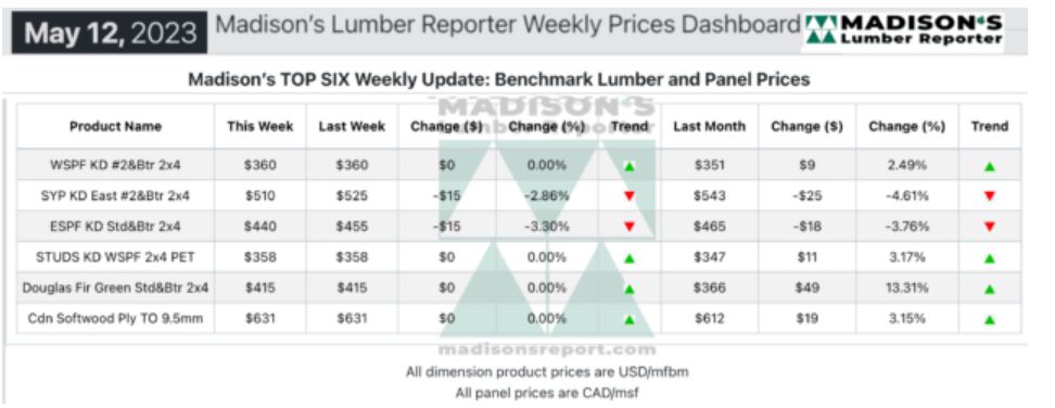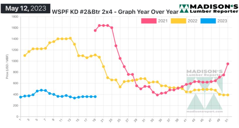 In the week ending May 12, 2023, the price of benchmark softwood lumber item Western Spruce-Pine-Fir 2×4 #2&Btr KD (RL) was again US$360 mfbm, which is flat from the previous week. This is up by $9, or two per cent, from one month ago when it was $351.