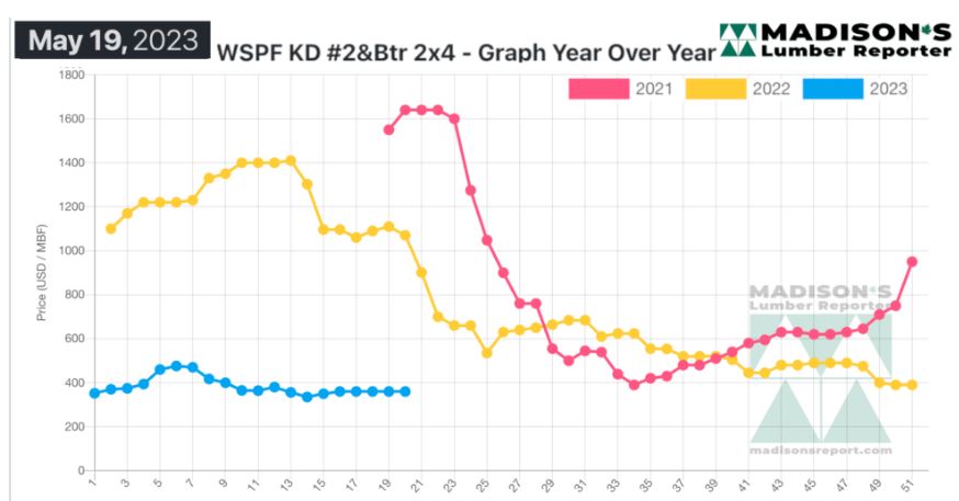 In the week ending May 19, 2023, the price of Western Spruce-Pine-Fir 2×4