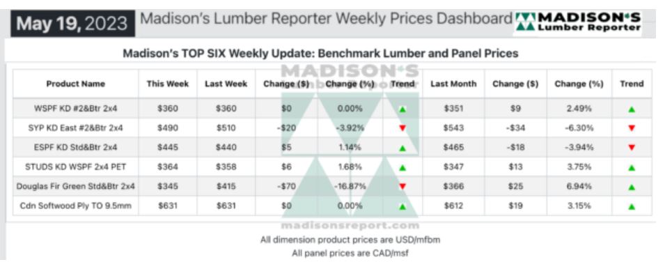 Madison’s Benchmark Top-Six Softwood Lumber and Panel Prices: Monthly