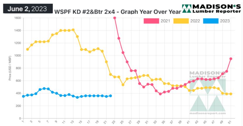 In the week ending June 2, 2023, the price of Western Spruce-Pine-Fir 2×4