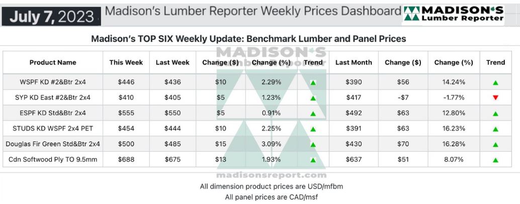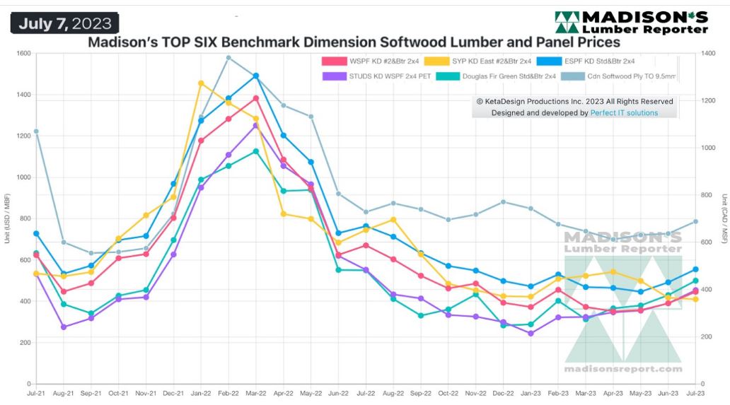 Madison’s Benchmark Top-Six Softwood Lumber and Panel Prices: Monthly