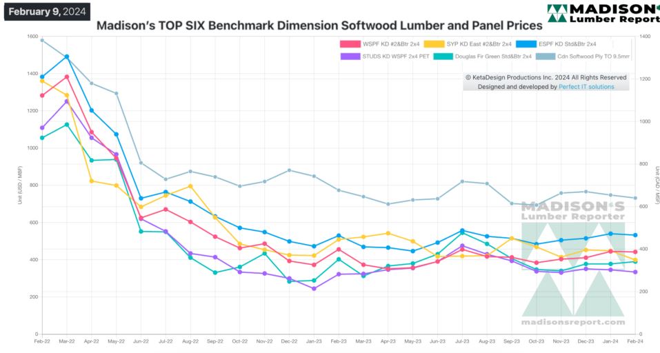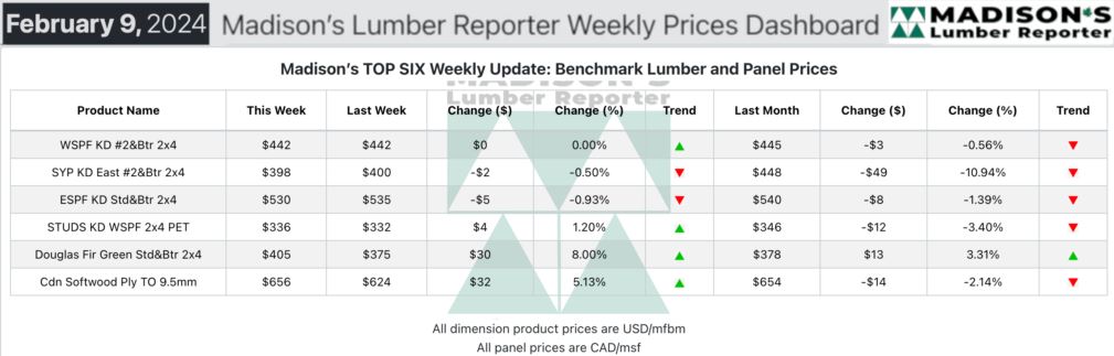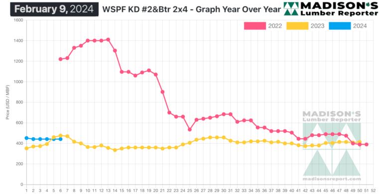 In the week ending February 9, 2024, the price of benchmark softwood lumber item Western Spruce-Pine-Fir 2×4 #2&Btr KD (RL) was US$442 mfbm. This is flat compared to the previous week when it was $442. That week’s price is down by -$3, or -1%, from one month ago when it was $445.