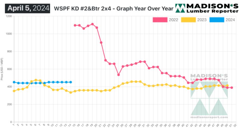 Compared To The Same Week Last Year, When It Was Us$355 Mfbm, The Price Of Western Spruce-Pine-Fir 2×4 #2&Btr Kd (Rl) For The Week Ending April 5, 2024 Was Up By +$117, Or +35%.
