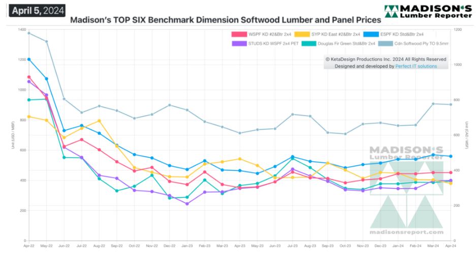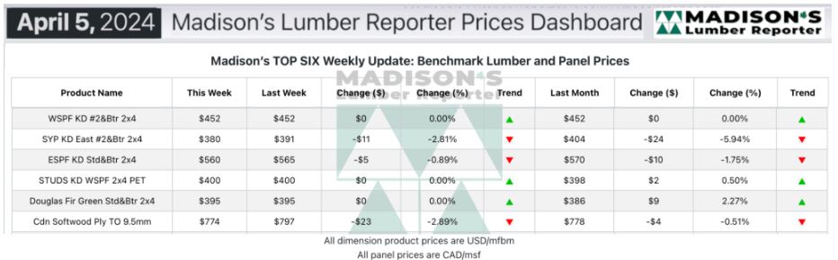 In the week ending April 5, 2024, the price of benchmark softwood lumber item Western Spruce-Pine-Fir 2×4 #2&Btr KD (RL) was US$452 mfbm. This is flat compared to the previous week when it was $452.