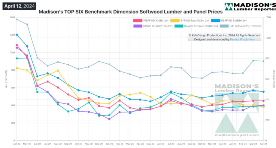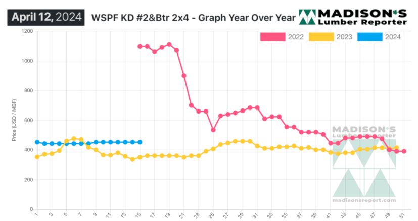 In the week ending April 12, 2024, the price of Western Spruce-Pine-Fir 2×4