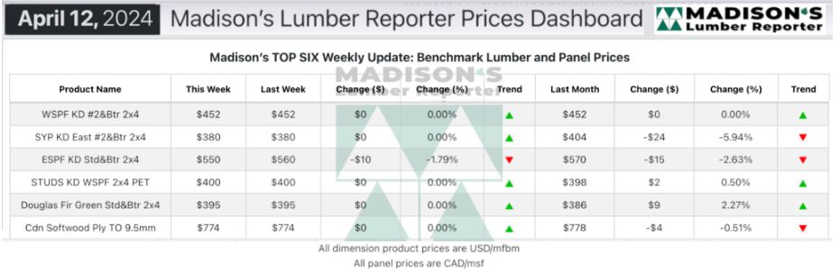 Remaining steady at US$452 mfbm, that benchmark WSPF 2×4 price is now up by