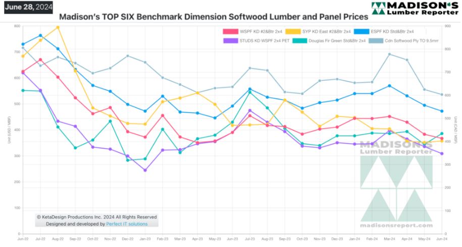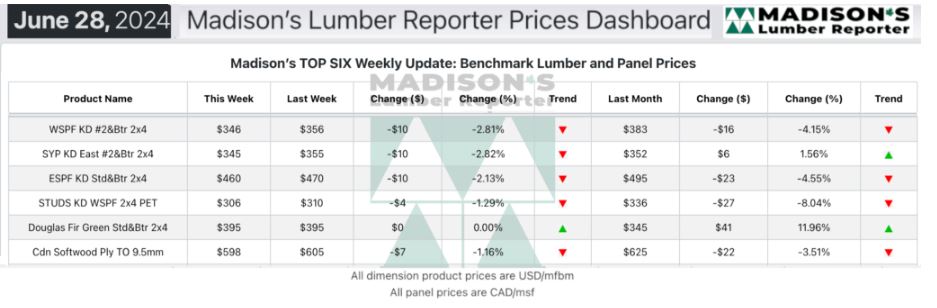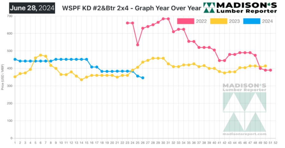 In the week ending June 28, 2024, the price of benchmark softwood lumber item Western Spruce-Pine-Fir 2×4 #2&Btr KD (RL) was US$346 mfbm. This is down -$10, or -3%, from the previous week when it was $356.