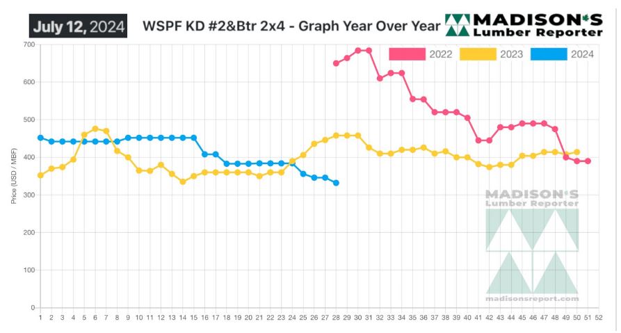 In the week ending July 12, 2024, the price of Western S-P-F 2x4 #2&Btr KD (RL)