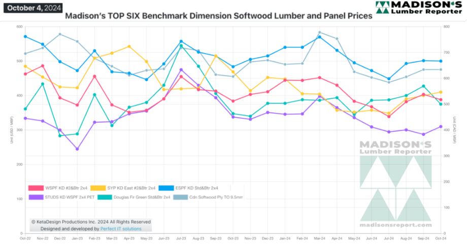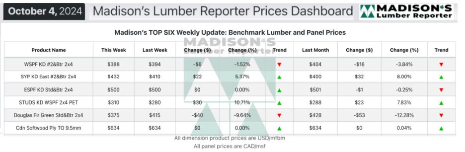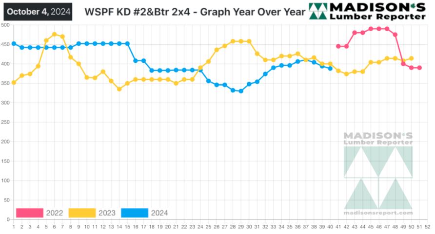In the week ending October 4, 2024, the price of benchmark softwood lumber item Western Spruce-Pine-Fir 2×4 #2&Btr KD (RL) was US$388 mfbm. This is down -$6, or -2%, from the previous week when it was $394, said weekly forest products industry price guide newsletter Madison’s Lumber Reporter. That week’s price is down -$16, or -4%, from one month ago when it was $404.