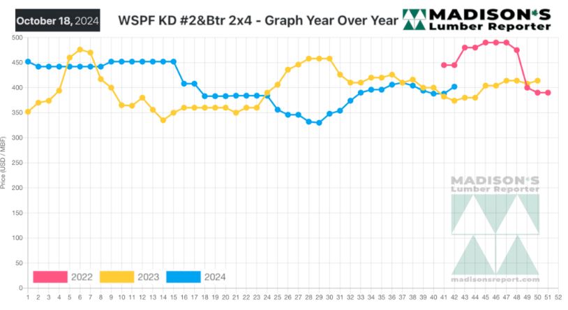 item Western Spruce-Pine-Fir 2×4 #2&Btr KD (RL) was US$402 mfbm. This is up