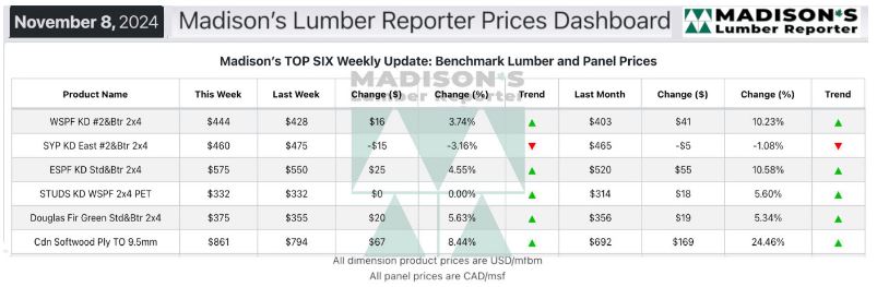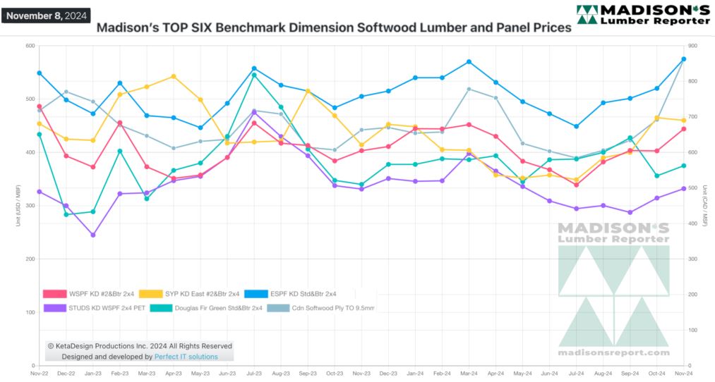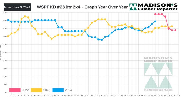 In the week ending November 8, 2024, the price of benchmark softwood lumber item Western Spruce-Pine-Fir 2x4 #2&Btr KD (RL) was US$444 mfbm. This is up +$16, or +4%, from the previous week when it was $428, said weekly forest products industry price guide newsletter Madison’s Lumber Reporter.