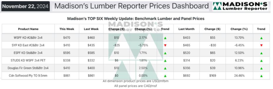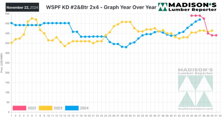 2×4 #2&Btr KD (RL) was US$470 mfbm, which up +$10, or +2%, from the previous