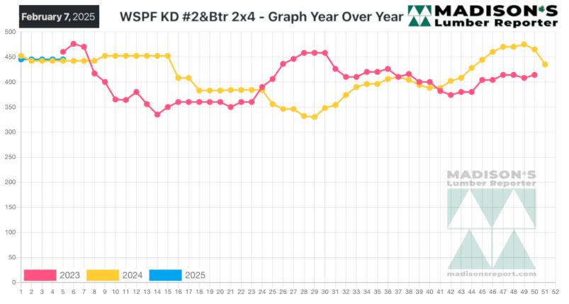 In the week ending February 7, 2025, the price of benchmark softwood lumber item Western Spruce-Pine-Fir 2×4 #2&Btr KD (RL) was US$445 mfbm.