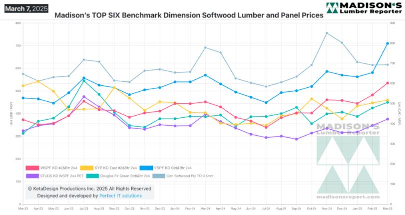 In the week ending March 07, 2025, the price of benchmark softwood lumber