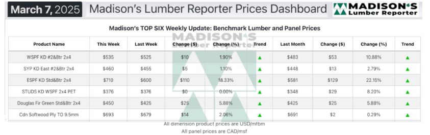 MADISON’S BENCHMARK TOP-SIX SOFTWOOD LUMBER AND PANEL PRICES: MONTHLY