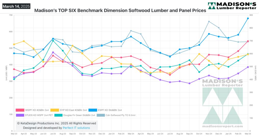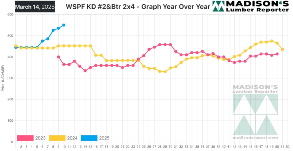 In the week ending March 14, 2025 the price of Western Spruce-Pine-Fir 2×4