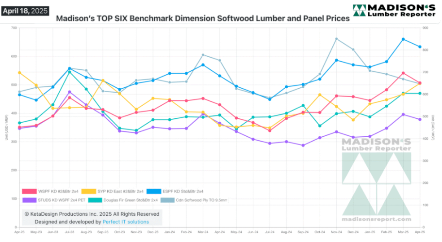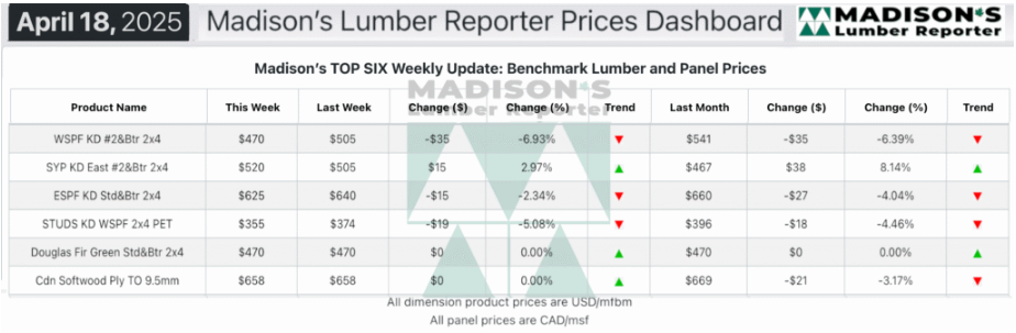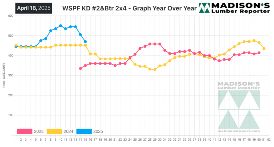 In the week ending April 18, 2025, the price of benchmark softwood lumber item Western Spruce-Pine-Fir 2×4 #2&Btr KD (RL) was US$470 mfbm.