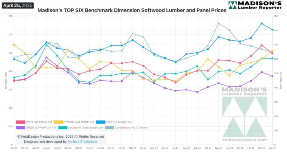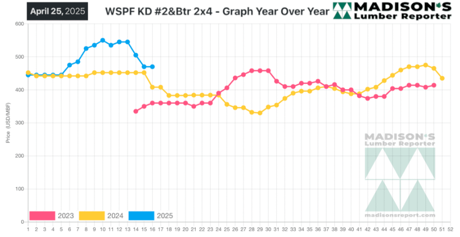 In the week ending April 25, 2025 the price of Western Spruce-Pine-Fir 2×4