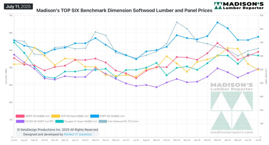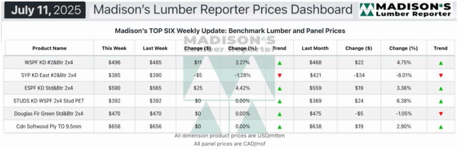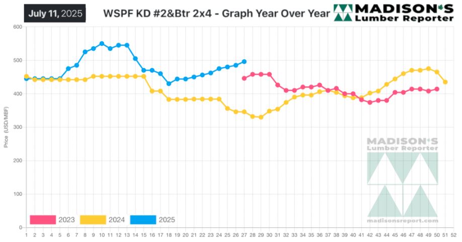 In the week ending July 11, 2025 the price of Western Spruce-Pine-Fir 2×4 #2&Btr KD (RL) was US$496 mfbm, which is up +$11, or +2%, from the previous week when it was $485, said weekly forest products industry price guide newsletter Madison’s Lumber Reporter.
