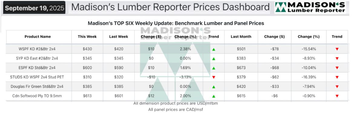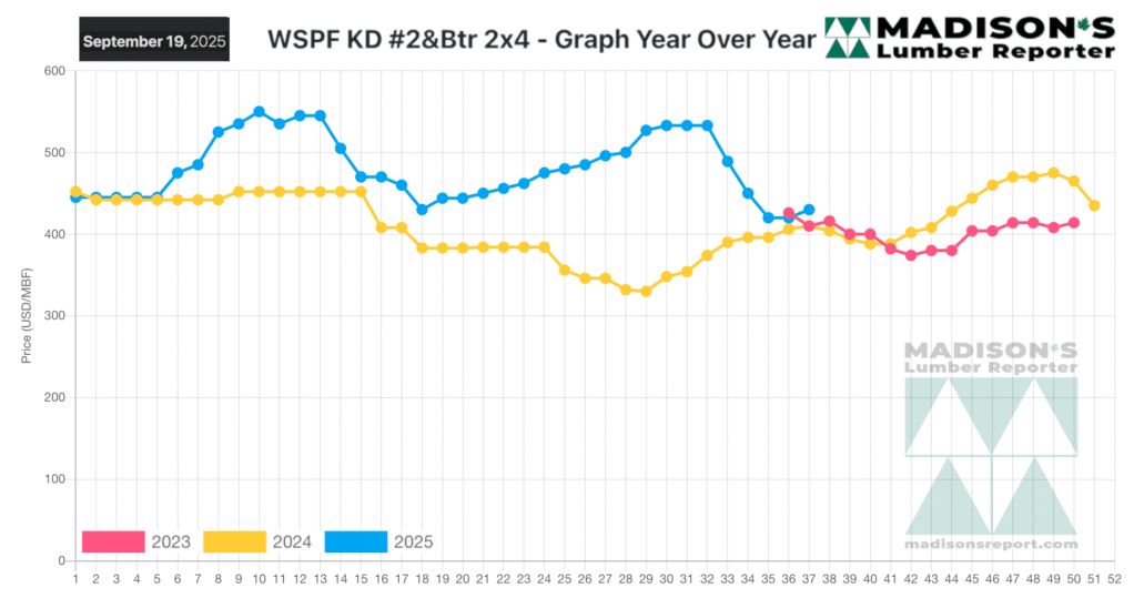 In the week ending September 19, 2025 the price of Western Spruce-Pine-Fir 2×4 #2&Btr KD (RL) was US$430 mfbm, which was up +$10, or +2%, from the previous week when it was $420, said weekly forest products industry price guide newsletter Madison’s Lumber Reporter.