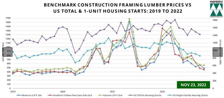 US Total and Single-Family Housing Starts vs. Madison's Benchmark Softwood Dimension Lumber and Panel Prices: 2019 - 2022