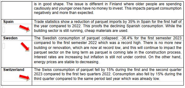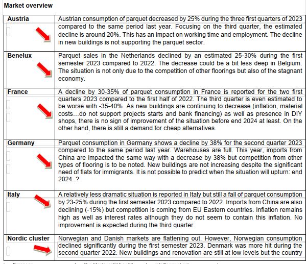 Echoing the general decline in construction activity, European parquet consumption decreased significantly during the first half of 2023. The Board of Directors of the European Parquet Federation, FEP, met on 18 October 2023, and discussed amongst others the parquet situation on the European markets. All in all, parquet markets fell in all FEP countries during the first semester 2023 compared to the same period last year. Reported decreases range from 15% to 38%. The main reason behind is the low activity in the construction sector for both new buildings and renovation. Construction activity is hampered by uncertainties and high interest rates, which are not sufficient to contain inflation. Both European and imported parquet are impacted. On the other hand, there is still a demand for cheap alternatives to real wood flooring. This situation is obviously affecting the level of activity. As construction output is not expected to upturn soon and as parquet is coming at the end of the building process, improvements are not forecast before end 2024 at least. A brief per country recap is provided in the table below. Source: European Parquet Federation |