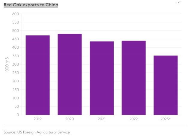 US foreign trade of hardwood lumber has declined sharply in 2023. Exporters have struggled to compete on price against alternative species in most offshore markets this year. Meanwhile, fading demand in the US has impeded imports, traders say. Hardwood lumber exports to offshore destinations fell to 1.56 million cubic meters through August, down 21% from the first eight months of 2022. At the current pace, exports will decline to the lowest volume since 2011, according to statistics from the US Foreign Agricultural Service. Exports to China are declining in 2023 Red Oak exports to China Volatility appears to be the hardwood import trend in recent years Imports plunged 32% through August to 241,436 cubic meters. The steep decline so far in 2023 maintains a roller coaster of trends evident in recent years. Shipments jumped 29% in 2018 compared to the previous year, then plummeted during the pandemic years, falling to a multi-year low in 2021 before rebounding strongly last year. Exports to China, by far the largest overseas market for US hardwoods, slipped to 696,063 cubic meters through August, trailing the year-ago eight-month volume by 10%. Shipments to China are on pace to decline for a third consecutive year after peaking in 2020 at 1.25 million cubic meters. Sales to other Pacific Rim destinations fell at a steeper rate compared to the decline in China. Shipments to Vietnam decreased 23% to 224,743 cubic meters. Exports to smaller markets in the region such as Indonesia, Thailand, South Korea, and Malaysia plunged between 44% and 54%. The downward trend was equally evident in Europe. Exports to the United Kingdom, historically the largest European market for US hardwoods, plunged 37% to 71,357 cubic meters. Deliveries to Germany and Italy fell 49% and 43%, respectively. Shipments to Spain slipped 18%. Portugal and United Arab Emirates represent some positives for offshore markets Portugal was among the steadiest offshore markets this year, with shipments about on par with the 2022 pace. Exports to the United Arab Emirates jumped 29%, one of the few destinations to post an increase. Red Oak exports offshore declined 18% through August to 463,416 cubic meters. Red Oak is by far the most commonly exported US hardwood species. Shipments to China fell 20% to 234,980 cubic meters, representing 62% of total Red Oak deliveries to offshore destinations. A 16% gain in Red Oak exports to Mexico mitigated the decidedly downward trend evident in shipments of most other species to that country. Total exports to Mexico fell 19% amid steep declines in Other Temperate, Maple, Western Red Alder, Yellow Poplar, and other species. White Oak exports plummeted 36% through August, falling to 288,899 cubic meters. Shipments to almost all destinations fell sharply. Japan was an exception, where deliveries increased 12%. Yellow Poplar exports declined 21% to 198,566 cubic meters. Shipments to Vietnam, the most common destination for that species, fell 23%. A 12% increase in exports to China ran counter to the downward trend evident worldwide. Declining use of hardwoods in the US furniture industry contributed to the lack of domestic demand for imports. Many manufacturers use more panel products in lieu of hardwoods, traders noted. Imports from Brazil and Germany, the two largest offshore suppliers, fell 47% and 30%, respectively. Shipments from Brazil are primarily Tropical hardwoods while imports from Germany are almost entirely Beech. Source: fastmarkets.com |