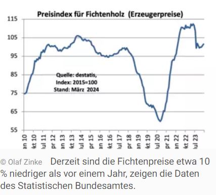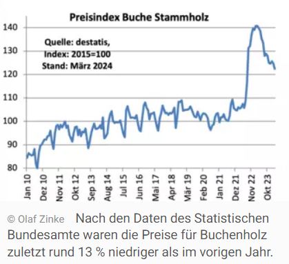 German timber prices hardly changed in May. Despite a difficult sales situation for both construction timber and exports. In any case, sales in the sawmill industry have shrunk significantly. This scenario will also determine the further development of timber prices. The sawmill industry continues to be well stocked with round sawn timber. Relatively high stock levels were also reported in May. At the same time, demand is relatively restrained both on the domestic market and in exports. In the first quarter of 2024, turnover in the German sawmill industry fell by 17% to €1.3 billion compared to the same period in the previous year, reports the industry portal Holzmarktinfo. Domestic sales fell by 20% to 723 million euros. Nevertheless, softwood prices remained relatively stable in most regions. This is also confirmed by the price reports from the Federal Statistical Office for spruce and pine wood (see chart). Depending on the region, between 90 and 105 euros per cubic metre (fm) were paid for the leading assortment of spruce A/C 2b+ in May. On average, the price is likely to be around 100 euros per cubic metre net. At the same time, spruce prices are around 10 % lower than a year ago, according to data from the Federal Statistical Office. However, the prices for beetle and D-wood have often been reduced, according to forest owners' associations. Depending on the buyer, discounts of 30 to 35 euros per cubic metre are reported. Due to the persistent rainfall in many places and poor trafficability, forest stocks are very high in a number of regions, according to reports. In addition, due to the numerous public holidays in May, the delivery times at the sawmills are restricted in some cases, which means that timber cannot be removed and marketed as planned. Slump in timber sales on the domestic market and in exports The business situation for German softwood sawmills improved slightly in May, reports the industry portal Holzmarktinfo. Sawmills consider their current situation to be adequate. In addition, expectations for the next three months were less pessimistic than before. However, exports fell significantly in the first quarter, which clearly restricts sales opportunities. At 1.4 million m³, exports of sawn softwood (rough timber) in the first three months of 2024 were around 9% lower than a year ago. Exports of softwood logs even fell by 36 % to 1.1 million cubic metres compared to the same period in the previous year. At 470,000 cubic metres, German exports of coniferous industrial timber shrank by 23 % compared to the same period in the previous year. However, weak sales of construction timber on the domestic market are likely to be one of the biggest problems on the timber market: In the first quarter of 2024, the construction of a total of around 53,500 homes was approved in Germany. Compared to the same period of the previous year, this represents a decline of 22%; compared to the first quarter of 2022, the decline is almost 40%. Spruce prices are currently around 10 per cent lower than a year ago, according to data from the Federal Statistic Hardwood market also under pressure Hardwood sawmillers are also relatively critical of the market outlook. The business climate there cooled noticeably in May 2024, reports Holzmarktinfo. The positive expectations of the previous month have given way to clear pessimism. Many forest owners also point out that the slightly cooler weather in recent weeks has only slowed down the development of the bark beetle. Therefore, material suitable for breeding should be processed and removed as quickly as possible. However, this is often difficult due to persistent rainfall and poor accessibility. With the rising temperatures, the spruce bark beetle is flying again. For this reason, it is very important to monitor spruce stands in order to recognise the infestation as early as possible, say forest owners' associations. According to data from the Federal Statistical Office, prices for beechwood were recently around 13% lower than in the previous year. กก Source: agrarheute.com |