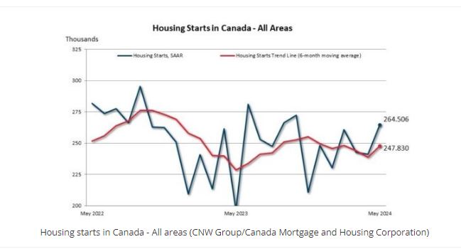 The total monthly seasonally adjusted annual rate (SAAR) of housing starts for all areas in Canada increased 10 per cent in May (264,506 units) compared to April (241,111), according to Canada Mortgage and Housing Corporation (CMHC).