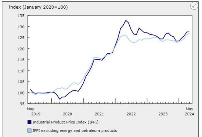 On Friday, Statistics Canada (StatCan) reported that the prices of products manufactured in Canada, as measured by the Industrial Product Price Index (IPPI), were unchanged month-over-month in May but were up 1.8% year-over-year.