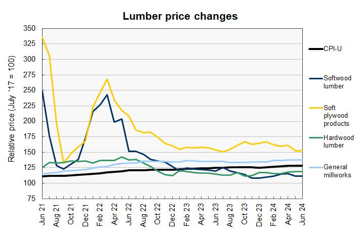 While prices for other wood products that we track are well off of their highs, the price of general millworks set a new high in June.