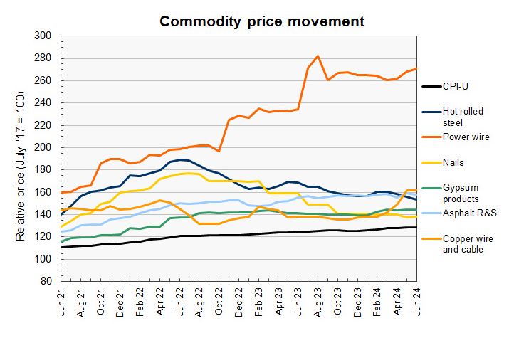 After making big jumps in recent months, the price index for copper wire was nearly unchanged this month, falling fractionally. It remains the leader for year-over-year price growth but trails power wire and cable by a wide margin for highest post-COVID price increase.