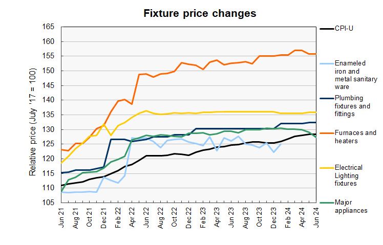 Note that the price index category for enameled iron and metal sanitary ware has disappeared from the detailed data reported with the producer price index. It seems to have been rolled up into the plumbing fixtures and fittings category and so will be dropped from this summary in the future.