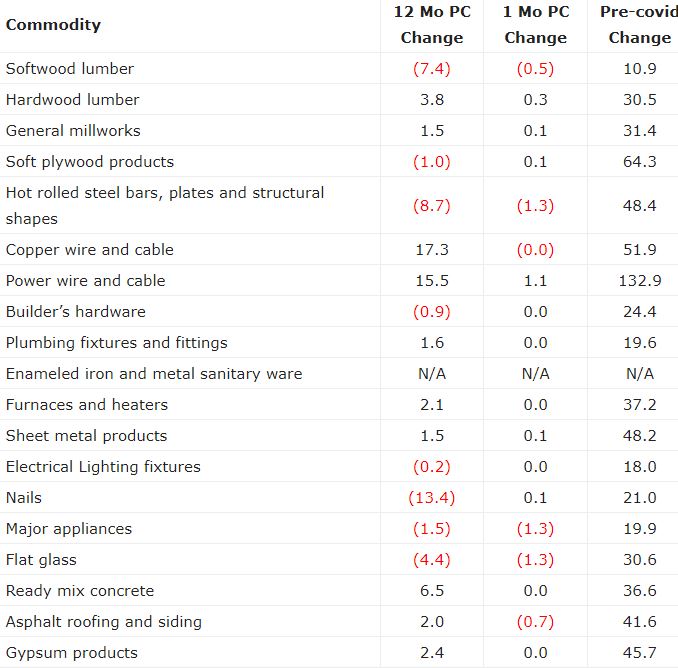 The pre-COVID column lists the change in the current construction materials prices relative to the average of prices from December 2019 through February 2020, before the pandemic impacted the economy. This provides a longer-term view of construction materials price trends.