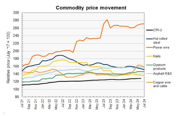 The price index for copper wire fell this month, aided by upward revisions to its values for the last three months. While up substantially from its price range in 2023, it is down nearly 4 percent from the multi-year high it reached in May. Its recent decline has its price now approaching the range it occupied in 2021.