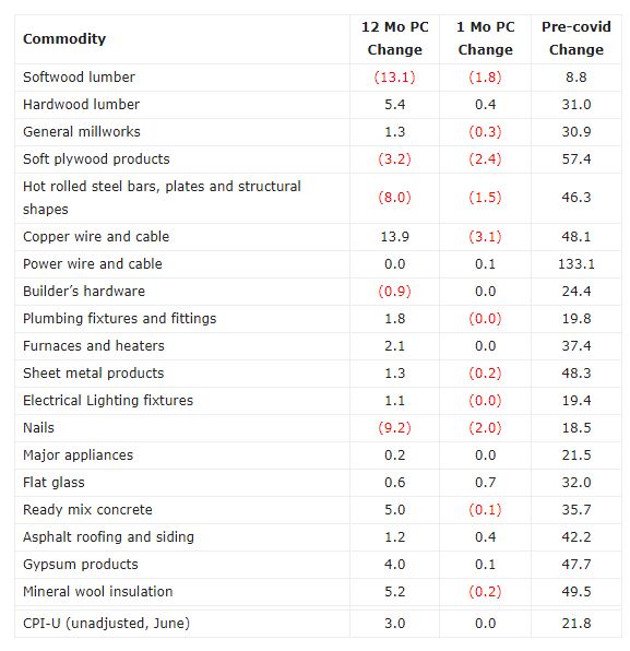Yield Pro compiled the BLS reported changes for our standard list of construction materials prices. These are prices of materials which directly impact the cost of constructing an apartment building. The first two right hand columns of the table provide the percent change in the price of the commodity from a year earlier (12 Mo PC Change) and the percent change in price from June (1 Mo PC Change). If no price data is available for a given commodity, the change is listed as N/A.